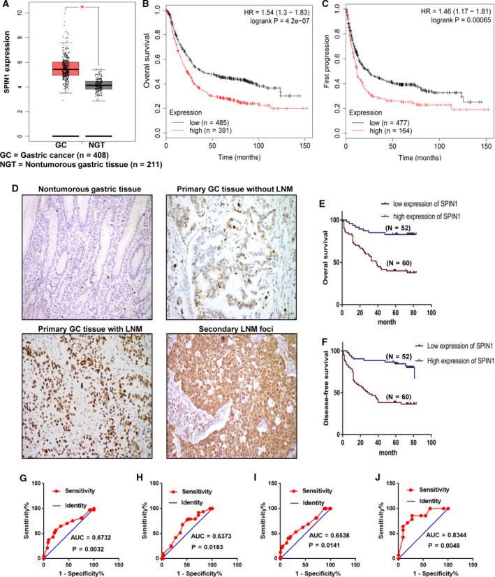 首先,作者使用GEPIA分析已发表数据,发现与正常组织相比,胃癌(GC)样本中的SPIN1表达明显升高。为了进一步评估SPIN1对GC的临床意义,作者建立了ROC曲线,最终结果表明了SPIN1可能在GC的发病机制中起重要作用,可作为GC患者的预后生物标志物。